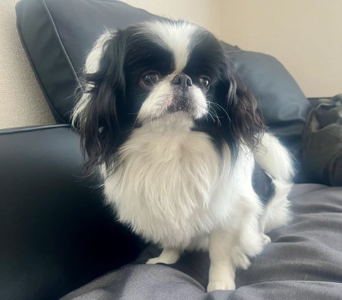 離れ気味で真ん丸な目や垂れ下がった耳、もふもふとした被毛が印象的な小型犬の狆。